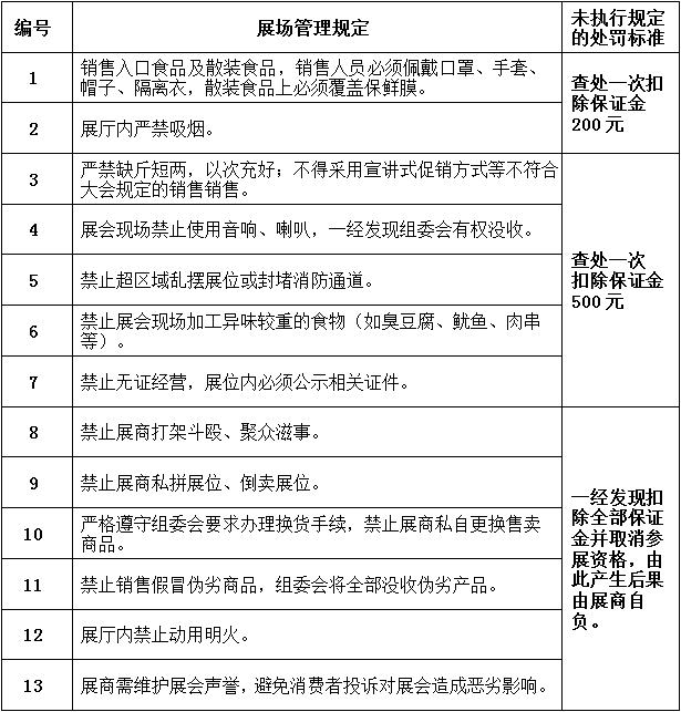 为营造展场良好购物环境,请您严格遵守以下展场管理规定,如有违反将按处罚标准扣罚保证金: